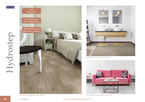 100% Waterproof New & Improved 5G Locking System High Density Sound Absorption Underlay Hydrostep Hydrostep HYDROSTEP • Pearl Grey Stone Tile HYDROSTEP • Welsh Oak Wood Plank HYDROSTEP • White Marble Stone Tile 80 Flooring www.formulabathrooms.co.uk